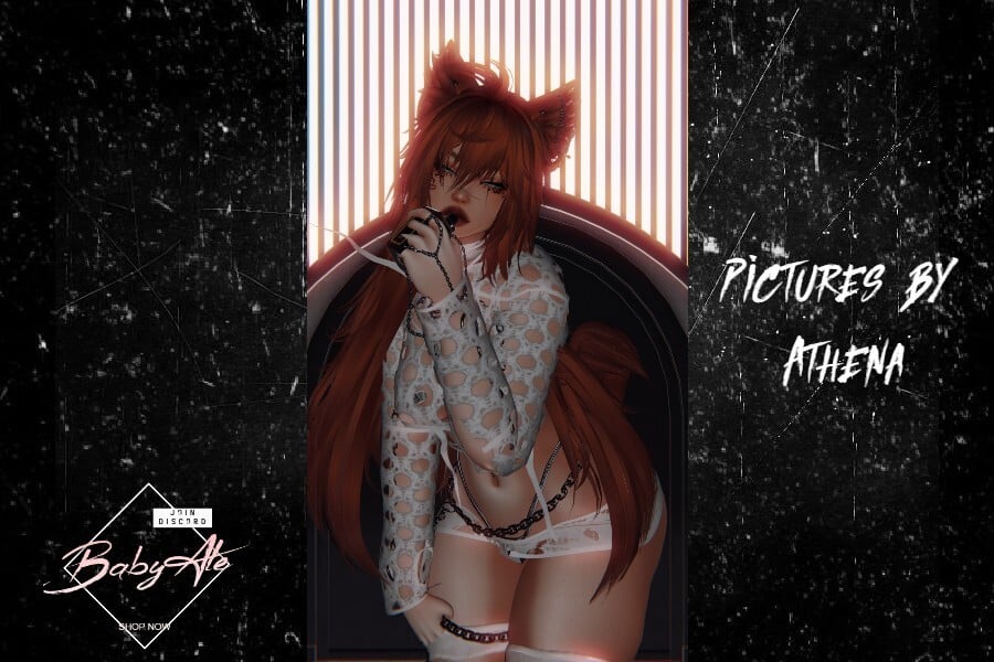 - Bra, Bodysuit, Sweater, Panties, Skirt, Shorts, Tights, Shoes, Heels, Chain choker, Cross chain, Rings, Cat Ears, and Cat tail.